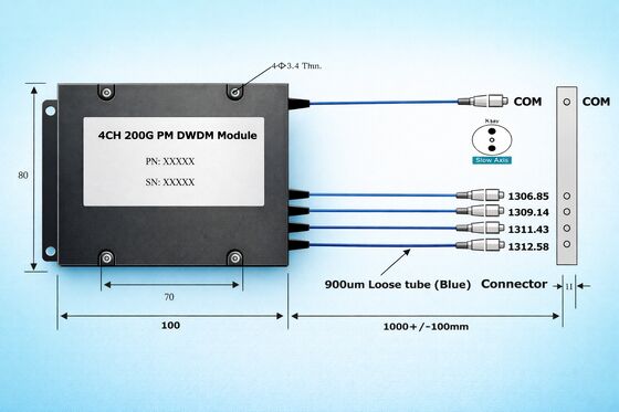 This 8-channel, 200 GHz O-Band PM DWDM Module is a polarization-maintaining (PM) Dense Wavelength Division Multiplexing/Demultiplexing module operating within the O-band. It is specifically designed for high-speed, multi-service transmission within the 1.3μm low-dispersion window. Featuring a 200 GHz channel spacing, the product supports two distinct 8-channel wavelength schemes, allowing for flexible selection based on specific project requirements. The module utilizes PM 13-U25D polarization-maintaining fiber, with a standard pigtail length of 1.0±0.1m. It is configured with a 0.9mm blue Hytrel jacket and comes with FC/APC connectors as the default option. The standard package dimensions are 100*80*10mm, facilitating easy integration into 1U/2U chassis or various photonic sub-modules.