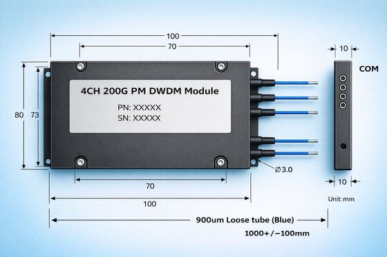 This 4-channel (4CH) 1310nm PM DWDM Module is a Polarization-Maintaining Dense Wavelength Division Multiplexing/Demultiplexing module operating within the 1310nm band. It is specifically designed for multi-service transmission within the 1.3μm low-dispersion window. The product offers four fixed channels with a channel spacing of 200GHz and a passband of λc±0.2nm, making it suitable for long-wave optical modules and optical communication systems operating at data rates of 1G and above. The module utilizes PM 1310 polarization-maintaining fiber for its pigtails—featuring a standard length of 1.0±0.1m—and is configured with a 0.9mm blue Hytrel jacket and FC/APC connectors. Its compact metal housing measures 100*80*10mm, facilitating easy integration into 1U/2U chassis or board-level sub-modules. Technical specifications indicate that the product is designed to balance low insertion loss, high extinction ratio, and high channel isolation; furthermore, it complies with both Telcordia and RoHS requirements, making it ideal for long-term deployment in high-reliability optical networks.