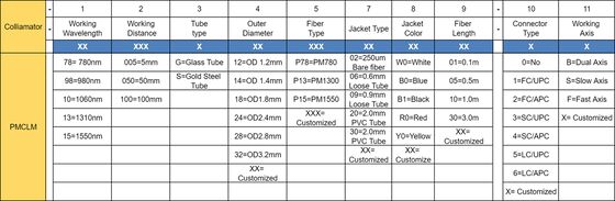 | PMCLM | 78= 780nm | 005=5mm | G=Glass Tube | 12=OD 1.2mm | P78=PM780 | 02=250um Bare fiber | W0=White | 01=0.1m | 0=No | B=Dual Axis | ||