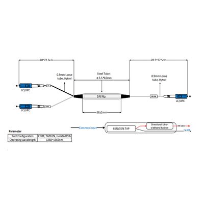 The Tap Isolator Hybrid Device is a passive hybrid component designed for use in fiber amplifier systems, optical power monitoring applications, and compact optical communication modules. This product integrates both optical tapping and optical isolation functions within a single package; it enables unidirectional transmission along the main link while diverting a small portion of the optical power for real-time monitoring and status detection. According to industry literature, such devices are typically deployed in fiber amplifiers, fiber optic instrumentation, and various fiber optic systems requiring signal monitoring. Key features include a compact form factor, low insertion loss, low polarization-dependent loss (PDL), and high isolation.